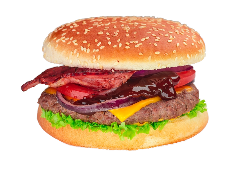 125g Irish-Beef, BBQ-Sauce, Cheddar, gegrillte Zwiebeln, gegrillte Tomaten, Salat, Bacon (Hähnchen)